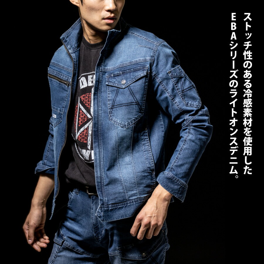 ■涼感素材 ■軽量 ■ストレッチ素材 <EBA657BR(長袖ジャケット)> ■1色展開 ■サイズ:S~5L <特徴> ■右胸ファスナーポケット ■左胸ペン差し ■内ポケット有り <EBA653BR(ノータックカーゴパンツ)> ■1色展開 ■サイズ:S~5L <特徴> ■コインポケット有り [混率] 綿73%・ナイロン25%・ポリウレタン2% [素材] ライトオンスデニム/6.7oz ※注意:ご利用のモニター環境により、色合いが異なって見える場合がございます。